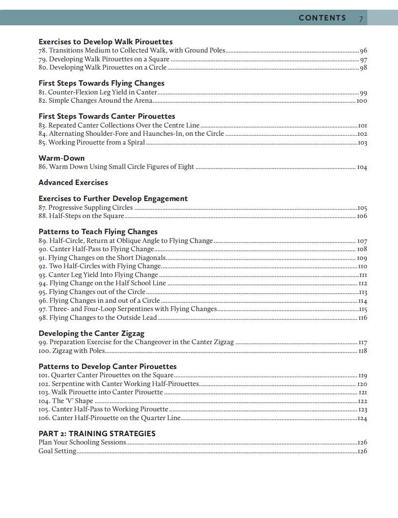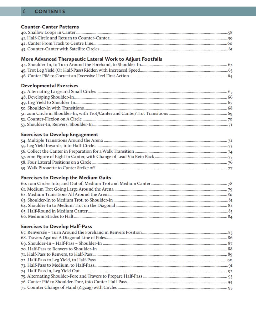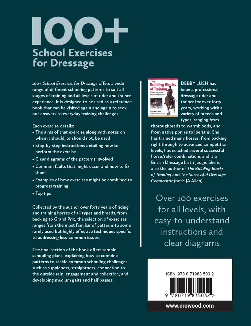 Over 100 exercises for all levels, with easy-to-understand instructions and clear diagrams. 100+ School Exercises for Dressage offers a wide range of different schooling patterns to suit all stages of training and all levels of rider and trainer experience. It is designed to be used as a reference book that can be visited again and again to seek out answers to everyday training challenges. Collected by the author over forty years of riding and training horses of all types and breeds, from backing to Grand Prix, the selection of exercises ranges from the most familiar of patterns to some rarely used but highly effective techniques specific to addressing less-common issues. The final section of the book offers sample schooling plans, explaining how to combine patterns to tackle common schooling issues, such as suppleness, straightness, connection to the outside rein, engagement and collection, and developing medium gaits and half passes.