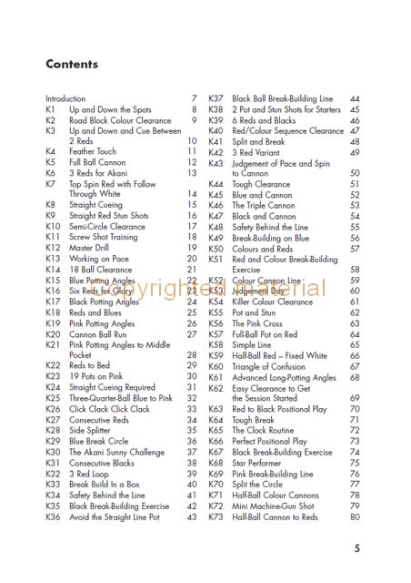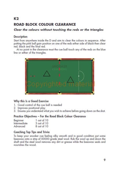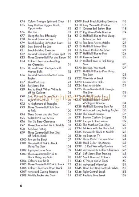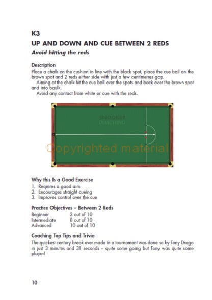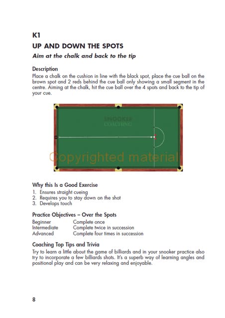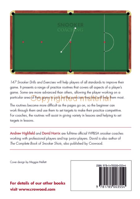 147 Snooker Drills and Exercises will help players of all standards to improve their game. It presents a range of practice routines that covers all aspects of a player’s game. Some are more advanced than others, allowing the player working on a particular area of their game to pick out the exercises they feel will help them most. The routines become more difficult as the pages go on, so the beginner can work through them and use them to set targets to make their practice competitive. For coaches, the routines will assist in giving variety in lessons and helping to set targets in lessons.