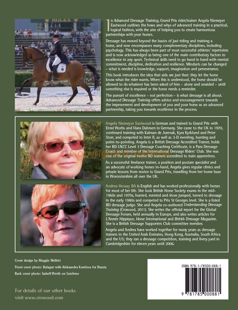 Andrea Hessay BA is English and has worked professionally with horses for most of her life. She is a listed BD dressage judge. She and Angela co-authored Understanding Dressage Training (Crowood 2011). She writes the official report for the Global Dressage Forum, held annually in Europe, and also writes articles for Horse International and British Dressage magazine. She is a British Dressage Supporters Club committee member.