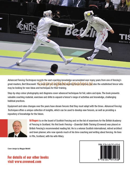 Ed Rogers is on the board of Scottish Fencing and on the list of examiners for the British Academy of Fencing in Scotland. His first book Fencing - Essential Skills Training (Crowood) was placed on the British Fencing's recommended reading list. He is a veteran Scottish international, retired architect and town planner, who now spends much of his time coaching and writing about fencing.