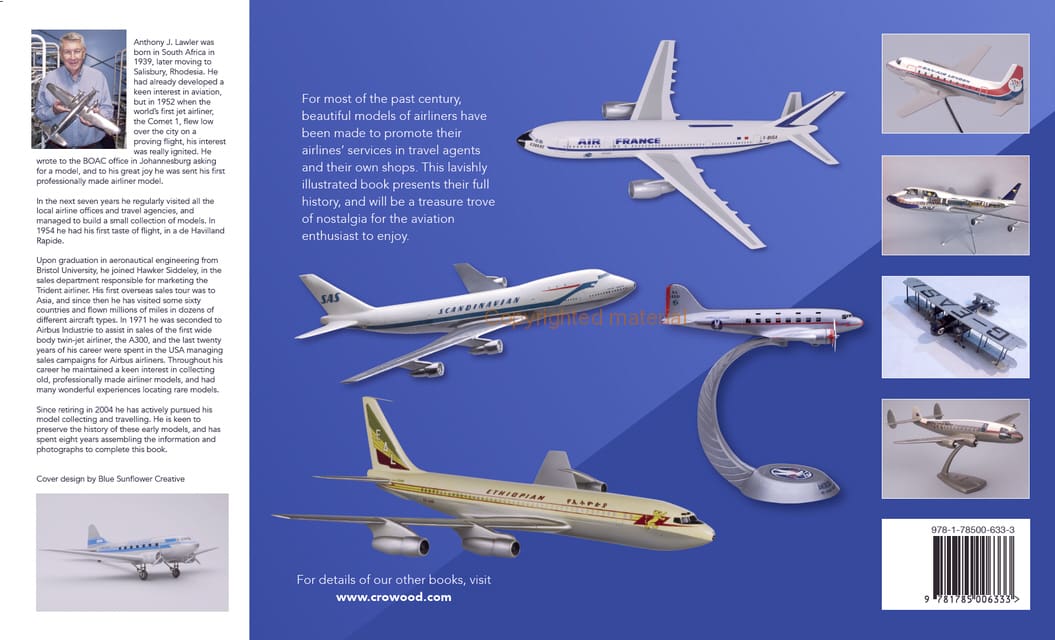 Anthony J Lawler was born in South Africa in 1939,later moving to Salisbury, Rhodesia. He had already developed a keen interest in aviation, but in 1952 when the world's first jet airliner, the Comet 1 flew over the city on a proving flight, his interest was really ignited. He wrote to the BOAC office in Johannesburg asking for a model, and to his great joy he was sent his first professionally made airliner model. In the next seven years he regularly visited all the local airline offices and managed to build a small collection of models. Upon graduation in aeronautical engineering from Bristol University, he joined Hawker Siddeley, in the sales department responsible for marketing the Trident airliner. In 1971 he was seconded to Airbus Industrie to assist in sales of the first wide body twin-jet airliner, the A300, and the last twenty years of his career was spent in the USA managing sales campaigns for the Airbus airliners. Since retiring in 2004 he has actively pursued his model collecting and travelling. He is keen to preserve the history of these early models, and has spent eight years assembling the information and photographs to complete this book.