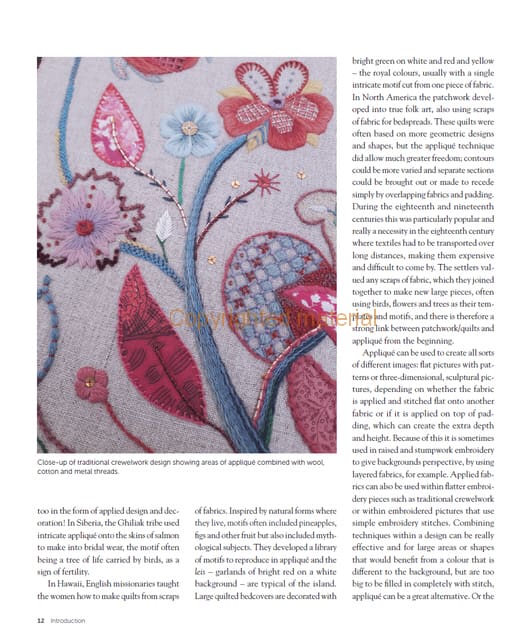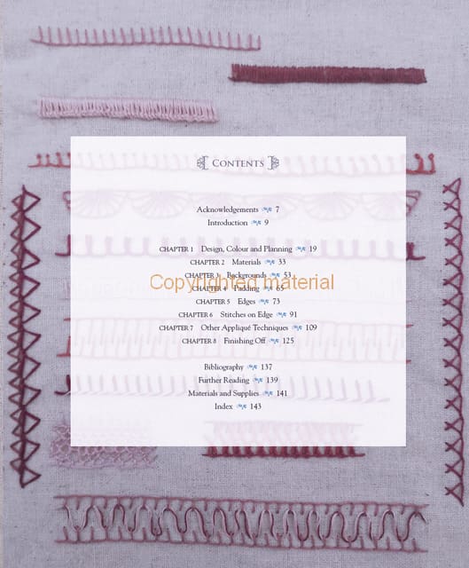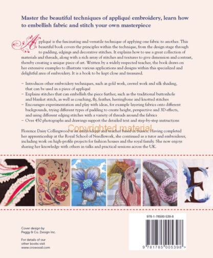 Applique is the fascinating and versatile technique of applying one fabric to another. This beautiful book covers the principles within the technique, from the design stage through to padding, edgings and decorative stitches. It explains how to use a great collection of materials and threads, along with a rich array of stitches and textures to give dimension and contrast, thereby creating a unique piece of art. It is lavishly illustrated with 450 colour photographs. Written by a widely respected teacher, the book draws on her extensive examples to illustrate various applications and designs within this specialized and delightful area of embroidery. It is a book to be kept close and treasured.