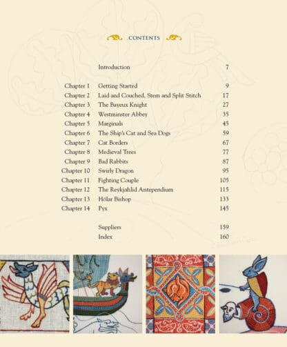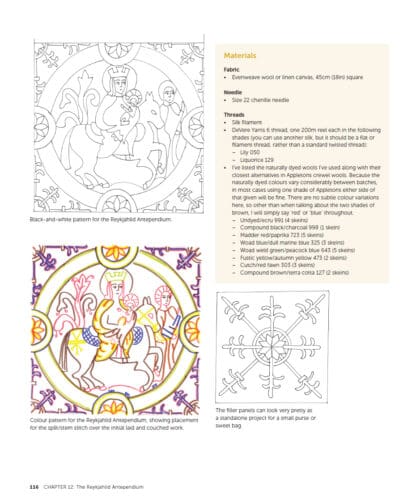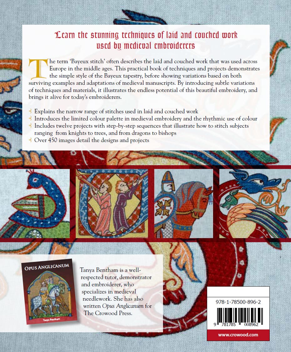 The term ‘Bayeux stitch’ often describes the laid and couched work that was used across Europe in the middle ages. This practical book of techniques and projects demonstrates the simple style of the Bayeux tapestry, before showing variations based on both surviving examples and adaptations of medieval manuscripts. It explains the narrow range of stitches used in laid and couched work and introduces the limited colour palette in medieval embroidery and the rhythmic use of colour. There are twelve projects with step-by-step sequences that illustrate how to stitch subjects ranging from knights to trees, and from dragons to bishops. By introducing subtle variations of techniques and materials, Tanya Bentham illustrates the endless potential of this beautiful embroidery, and brings it alive for today’s embroiderers.