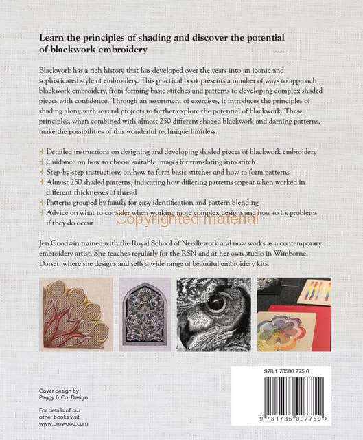 Blackwork has a rich history that has developed over the years into an iconic and sophisticated style of embroidery. This practical book presents a number of ways to approach blackwork embroidery, from forming basic stitches and patterns to developing complex shaded pieces with confidence. Through an assortment of exercises, it introduces the principles of shading along with several projects to further explore the potential of blackwork. Detailed instructions on designing and developing shaded pieces of blackwork embroidery are given along with guidance on how to choose suitable images for translating into stitch. Step-by-step instructions on how to form basic stitches and how to form patterns are included as well as almost 250 shaded patterns, indicating how differing patterns appear when worked in different thicknesses of thread. Finally, patterns are grouped by family for easy identification and pattern blending.