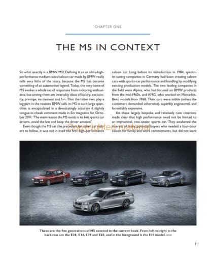 BMW’s M5 was a simple concept: a production 5 Series saloon re-developed for high performance by the Motorsport division. The M5 was the car that really initiated the legend of the M-cars from BMW. The letter M has been applied to a high-performance BMW as early as 1978, but that year’s M1 was an exotic supercar. It had the right image, but the M1 was never going to bring in major profits. The M5 was much simpler in concept. It was and remains a production 5 Series saloon, redeveloped for ultra-high performance. Manufacturing costs were minimized, allowing BMW to price the car more attractively and still bring in healthy profits. This new book charts the development of the M5 across five generations. For all fans of the BMW M5, this book provides essential background. It is packed with the facts and details that make the M5 legend come alive.