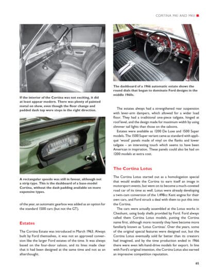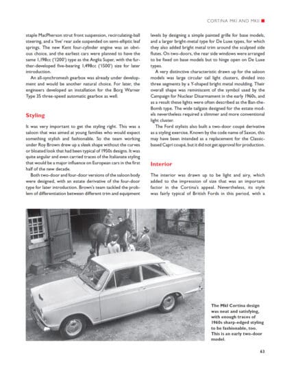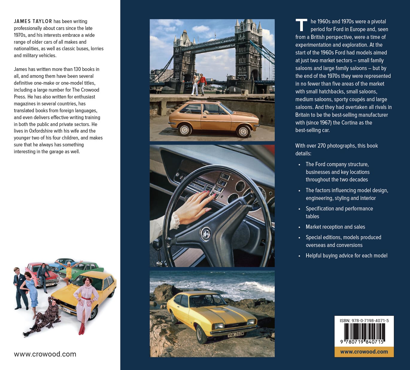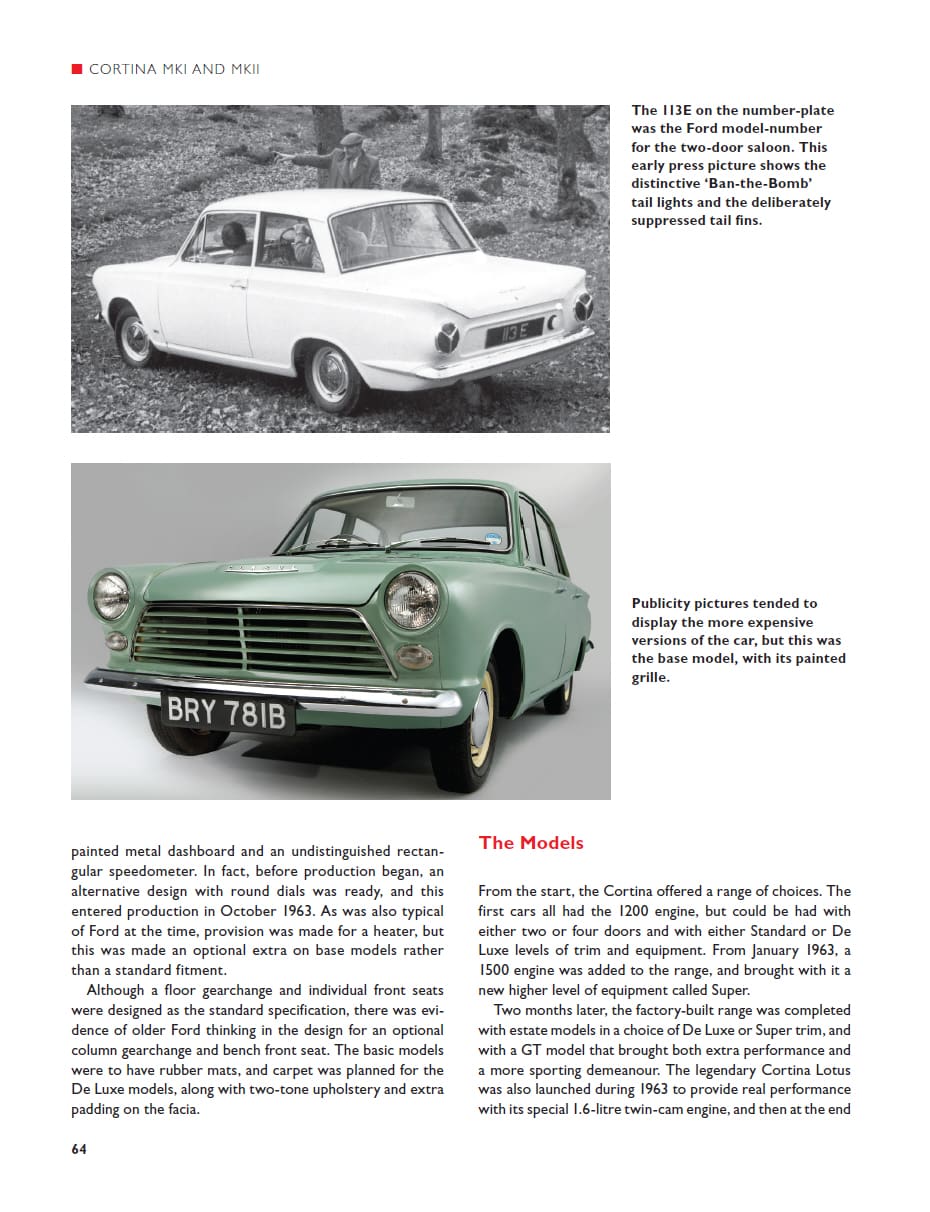 The 1960s and 1970s were a pivotal period for Ford in Europe and, seen from a British perspective, were a time of experimentation and exploration. At the start of the 1960s Ford had models aimed at just two market sectors – small family saloons and large family saloons – but by the end of the 1970s they were represented in no fewer than five areas of the market with small hatchbacks, small saloons, medium saloons, sporty coupés and large saloons. And they had overtaken all rivals in Britain to be the best-selling manufacturer with (since 1967) the Cortina as the best-selling car. With over 270 photographs, this book details: the Ford company structure, businesses and key locations throughout the two decades; the factors influencing model design, engineering, styling and interior; specification and performance tables; market reception and sales; special editions, models produced overseas and conversions and finally, helpful buying advice for each model.