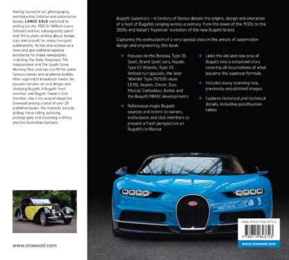 Having trained in art, photography, and industrial, interior and automotive design, Lance Cole switched to writing (as the 1983 Sir William Lyons Scholar) and has subsequently spent over thirty years writing about design, cars, and aircraft for many transport publications. He has also worked as a news and geo-political reporter worldwide for major newspapers, including The Daily Telegraph, The Independent and The South China Morning Post, and has also run PR for some famous names and academic bodies. After a period in broadcast media, his passion remains art and design and studying Bugatti. A Bugatti Trust member and Bugatti Owners Club member, with a total of over 20 published books. His interests include gliding, horse riding, painting, photography and travelling in Africa and the Australian Outback.