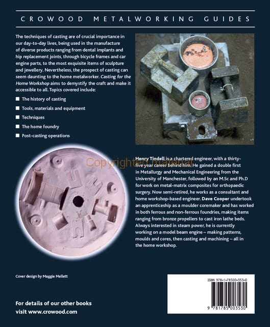 The techniques of casting are of crucial importance in our day-to-day lives, being used in the manufacture of diverse products ranging from dental implants and hip replacement joints, through bicycle frames and car engine parts, to the most exquisite items of sculpture and jewellery. Nevertheless, the prospect of casting can seem daunting to the home metalworker. Casting for the Home Workshop aims to demystify the craft and make it accessible to all. Topics covered include the history of casting; tools, materials and equipment; techniques; the home foundry and post-casting operations.
