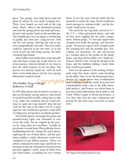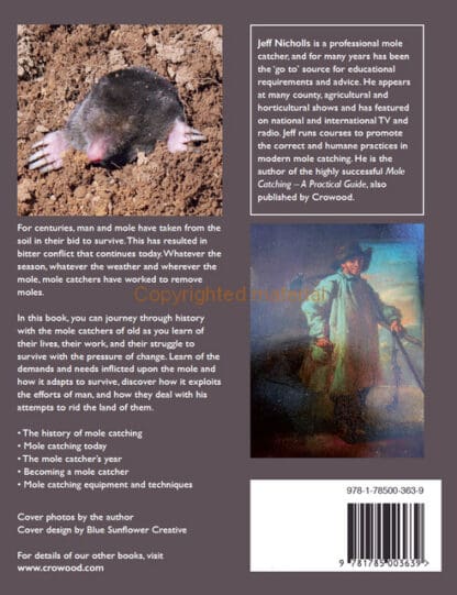 For centuries, man and mole have taken from the soil in their bid to survive. This has resulted in bitter conflict between these adversaries and one that continues today. Whatever the season, whatever the weather, wherever the mole! Mole catchers have worked to remove moles. Journey through history with the mole catchers of old as you learn of their lives, their work, and their struggle to survive with the pressure of change. Learn of the demands and needs inflicted upon the mole and how it adapts to survive, discover how it exploits the efforts of man, and how they deal with his plight to rid the land of them. Follow Jeff Nicholls through a typical year in the life of a mole catcher and explore the secrets of success to be mole free. Understand the relationship between man and mole both in alliance and conflict, and unearth your passion towards the little man in black. Jeff Nicholls has previously written books on mole catching but this is his most personal composition, providing the knowledge to compete on a level playing field and fully understand the rules of engagement. It will be a mole catcher’s handbook for many years to come containing everything you ever need to know.