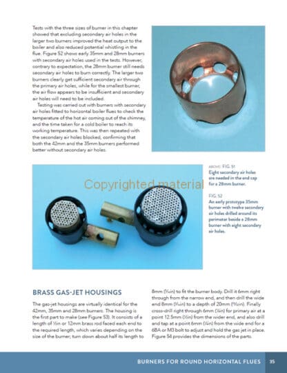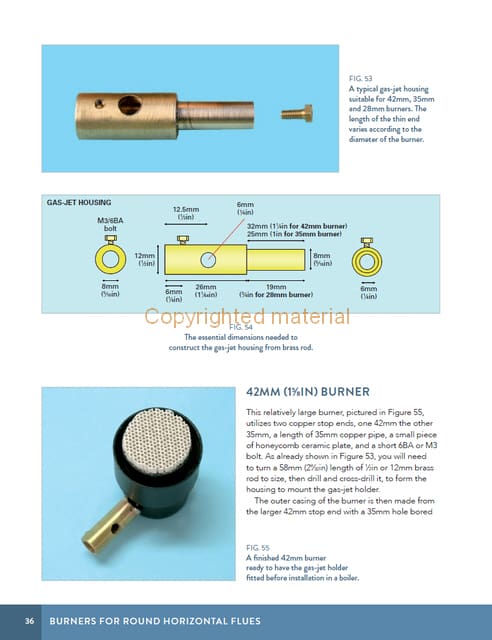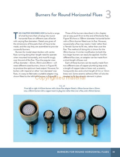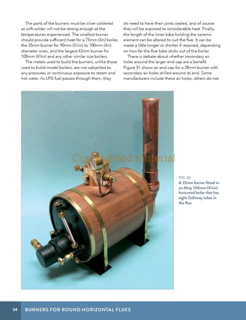 This book covers the materials needed to make ceramic burners and explains how to silver solder them. It discusses LPG and holding tanks, as well as connecting pipework and electronic and mechanical automatic gas-control systems to monitor the boiler pressure. In addition, there is advice on how to set up, install and operate each burner to provide optimum heating to the boiler. A summary of the Boiler Test Code Volume 3 that applies to home-made gas tanks is included, together with a list of useful suppliers with their contact details. This book provides all the information you need to build and operate: three burners, with one variant, for boilers with 42mm, 35mm and 28mm horizontal flues; two round burners for vertical boilers with fire boxes; two different sizes of rectangular burner, with one variant, for use in horizontal water-tube or pot boilers and finally, one small round and one tiny oblong burner for use in Mamod and Wilesco boilers. The burners described are straightforward to make and simple to use to heat the water in boilers that meet the 3 bar litre limit in the UK Boiler Test Code.