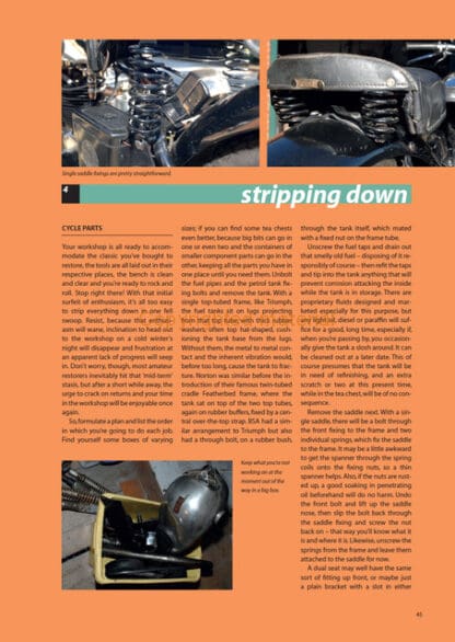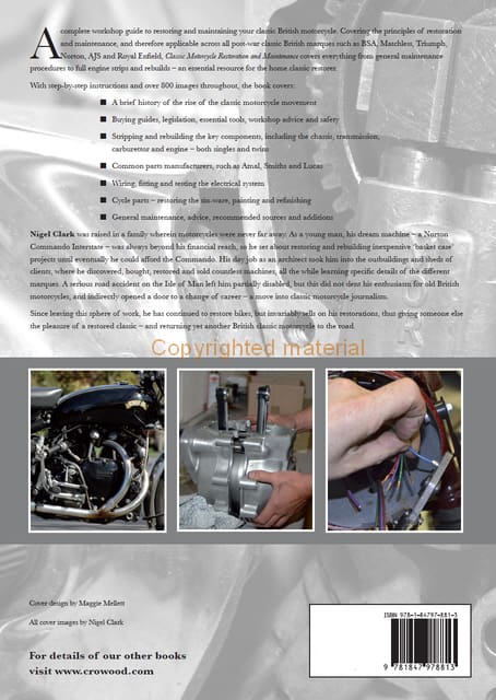 A complete workshop guide to restoring and maintaining your classic British motorcycle. Covering the principles of restoration and maintenance, and therefore applicable across all post-war classic British marques such as BSA, Matchless, Triumph, Norton, AJS and Royal Enfield, Classic Motorcycle Restoration and Maintenance covers everything from general maintenance procedures to full engine strips and rebuilds. With step-by-step instructions and over 800 images throughout, the book covers, amongst other things, buying guides, legislation, essential tools, workshop advice, safety stripping and rebuilding the key components for both singles and twins. The common parts manufacturers, such as Amal, Smiths and Lucas are covered too. With general maintenance, advice, recommended sources and additions included – this new book is an essential resource for the home classic restorer.
