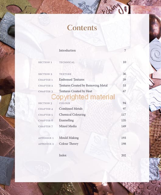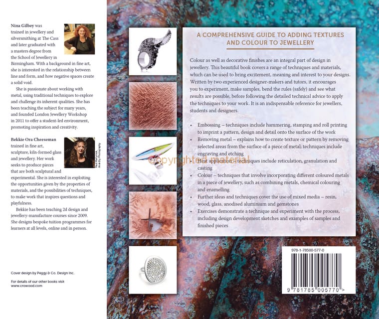 Decorative textures and colour are integral to the design of every piece of jewellery. This beautiful book covers a range of techniques and materials, which can be used to bring excitement, meaning and interest to your designs. Written by two experienced designer-makers and tutors, it encourages you to experiment, make samples, bend the rules (safely) and see what results are possible, before following the detailed technical advice to apply the techniques to your work. Topics covered include: embossing – techniques include hammering, stamping and roll printing to imprint a pattern, design and details onto the surface of the work. Heat application is covered and techniques include reticulation, granulation and casting. Further ideas and techniques cover the use of removing metal; colour techniques incorporating coloured metals in a piece of jewellery and the use of mixed media i.e. resin, wood, glass, anodised aluminium and gemstones. There are exercises that demonstrate a technique and experiment with the process, including