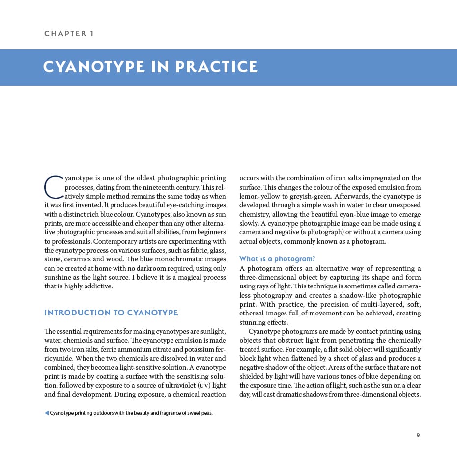 This practical book is a complete guide to the beautiful process of making cyanotype photograms and photographic prints, also known as camera-less photography and sun printing. It demonstrates the different ways to explore working with cyanotypes using toning techniques, gold leafing, decorative textures and artists’ books. Aimed at all artists and photographers, it shows how the traditional method can be advanced to produce inspirational work.