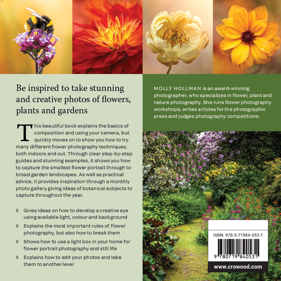 Molly Hollman is an award-winning photographer, who specializes in flower, plant and nature photography. She runs flower photography workshops, writes articles for the photographic press and judges photography competitions.