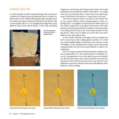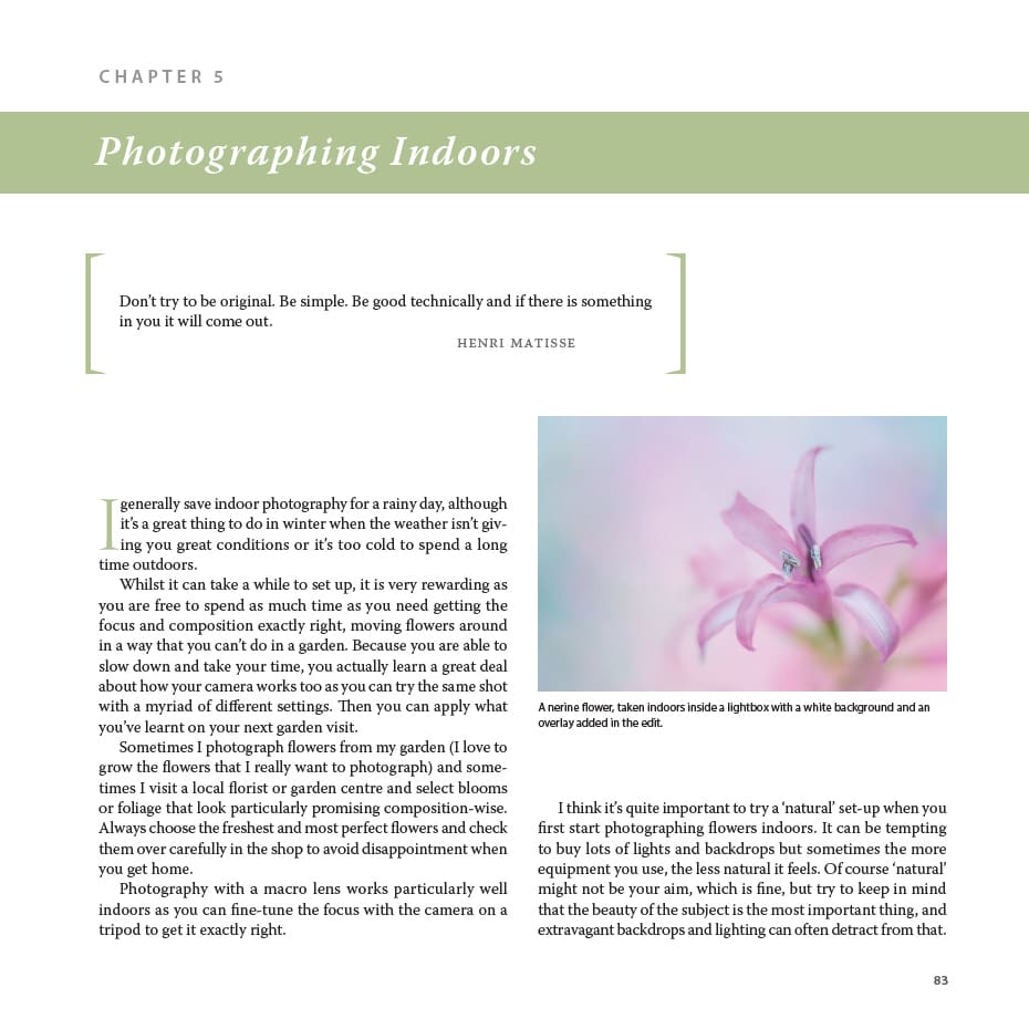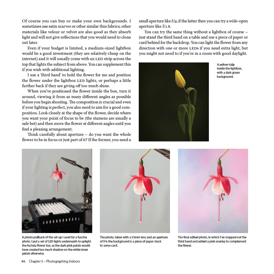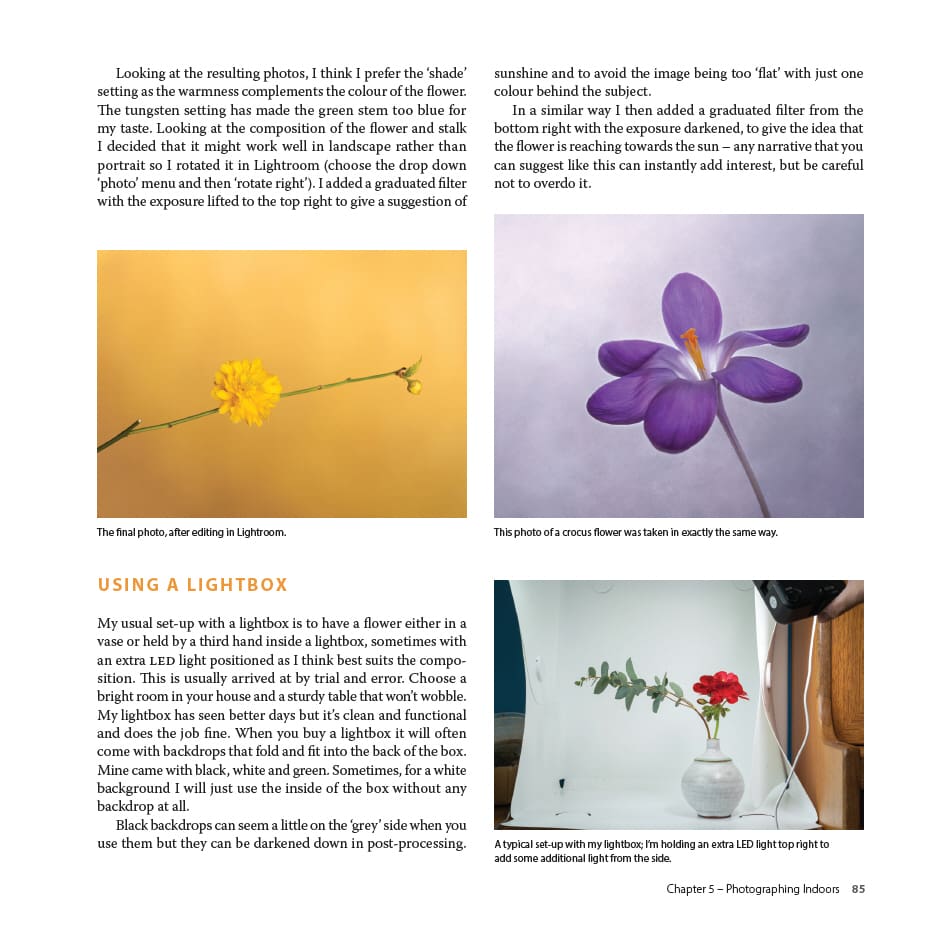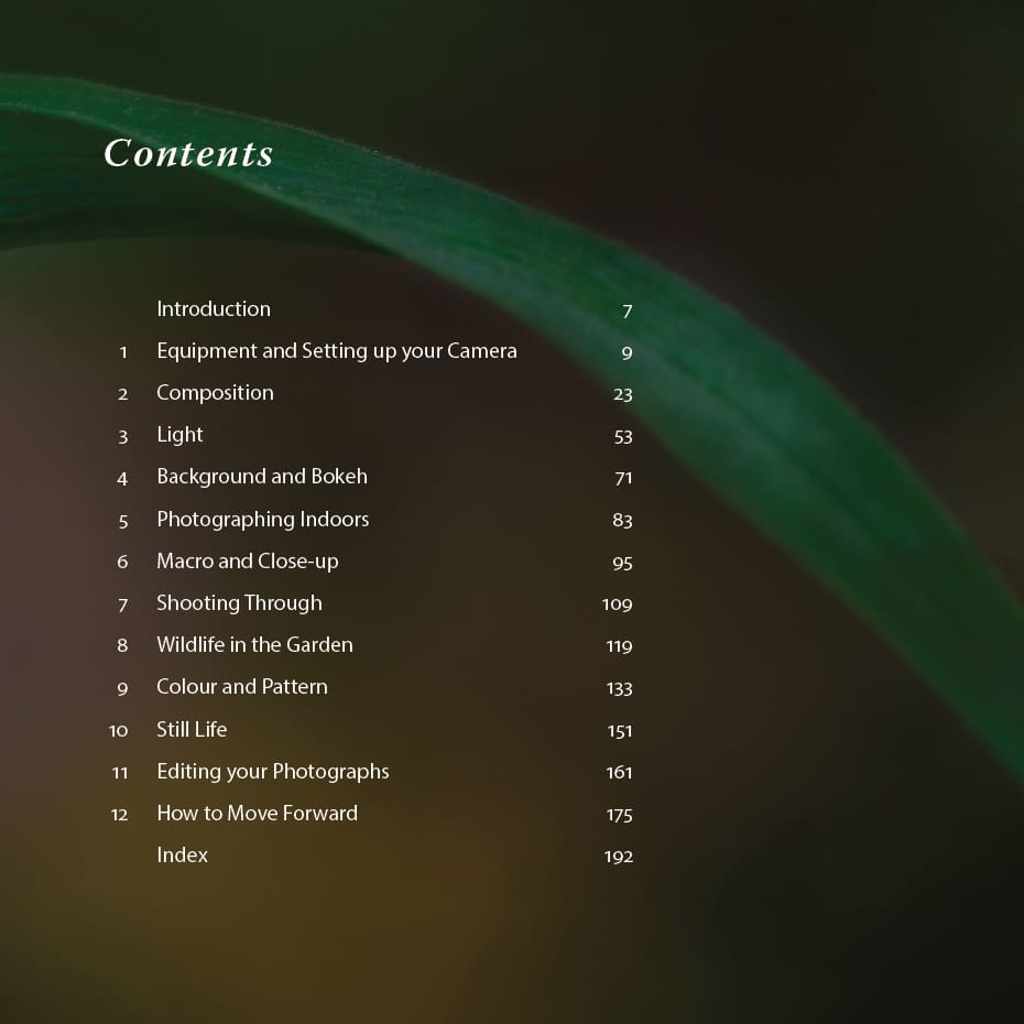 This beautiful book explains the basics of composition and using your camera, but quickly moves on to show you how to try many different flower photography techniques, both indoors and out. Through clear step-by-step guides and stunning examples, it shows you how to capture the smallest flower portrait through to broad garden landscapes. There are ideas on how to develop a creative eye using available light, colour and background. The most important rules of flower photography are explained, and also how to break them. It shows how to use a light box in your home for flower portrait photography and still life and explains how to edit your photos and take them to another level. As well as practical advice it provides inspiration through a monthly photo gallery giving ideas of botanical subjects to capture throughout the year.