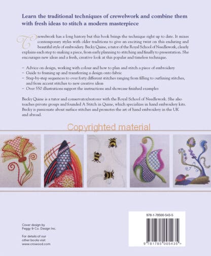 Crewelwork has a long history but this book brings the technique right up to date. It mixes contemporary styles with older traditions to give an exciting twist on this enduring and beautiful style of embroidery. Becky Quine, a tutor of the Royal School of Needlework, clearly explains each step to making a piece, from early planning to stitching and finally to presentation. She encourages new ideas and a fresh, creative look at this popular and timeless technique. Advice on design is given along with working with colour and how to plan and stitch a piece of embroidery. This new book includes a guide to framing up and transferring a desing onto fabric. There are step-by-step sequences to over forty different stitches ranging from filling to outlining stitches, and from accent stitches to new creative ideas.