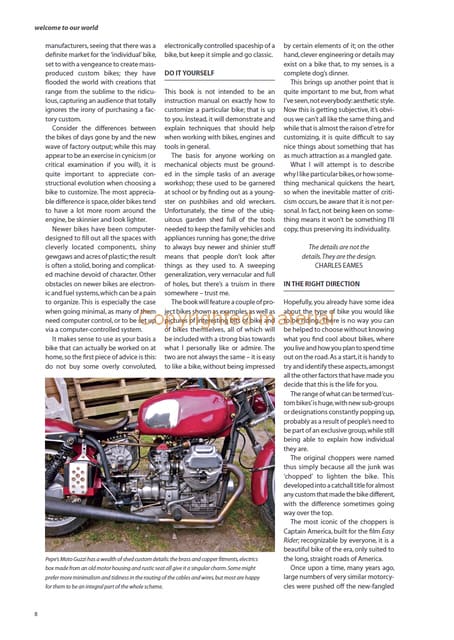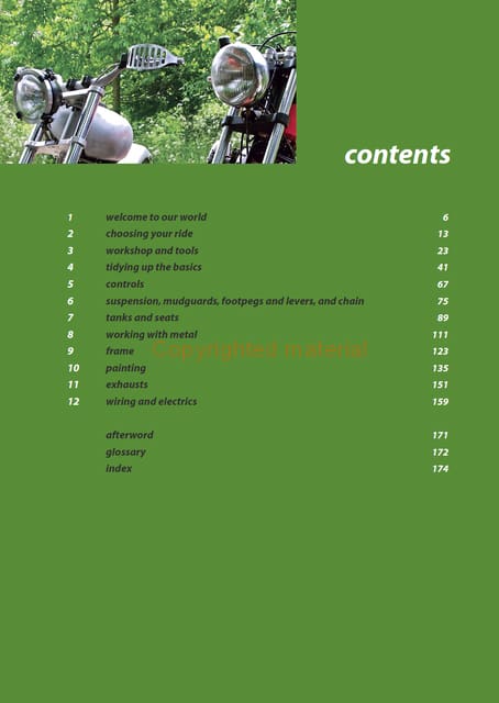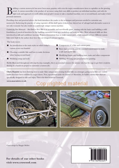 Chris Daniels has been learning how to make bikes unique since owning his first bike as a teenager, going on to fabricate custom builds that have been exhibited in major shows. Now, operational under the banner of Marmisto, he builds custom bikes that are specifically designed to ride and enjoy. This is his third book for Crowood. www.marmisto.co.uk