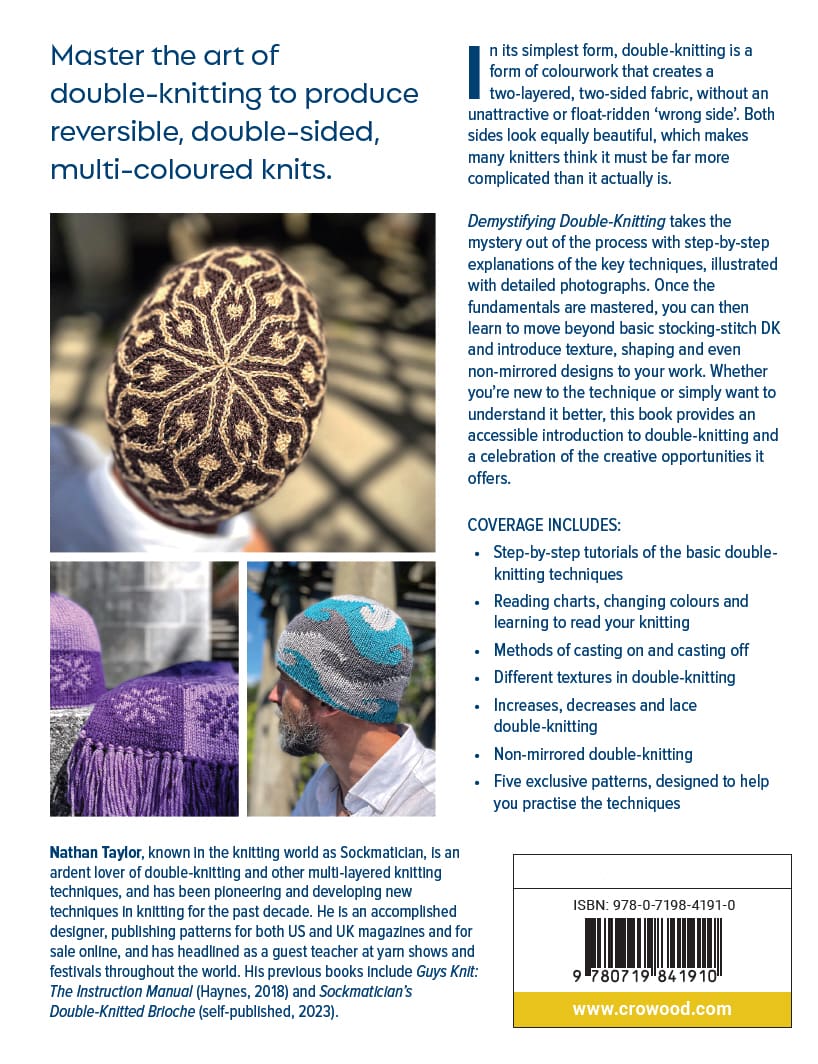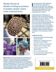 Nathan Taylor, known in the knitting world as Sockmatician, is an ardent lover of double knitting and other multi-layered knitting techniques, and has been pioneering and developing new techniques in knitting for the past decade. He is an accomplished designer, publishing patterns for both US and UK magazines and for sale online. He has headlined as a guest teacher at yarn shows and festivals across the UK and Europe, New Zealand, Australia, and on both coasts of the USA. His previous books include Guys Knit: The Instruction Manual (Haynes, 2018) and Sockmatician’s Double-Knitted Brioche (self-published, 2022).