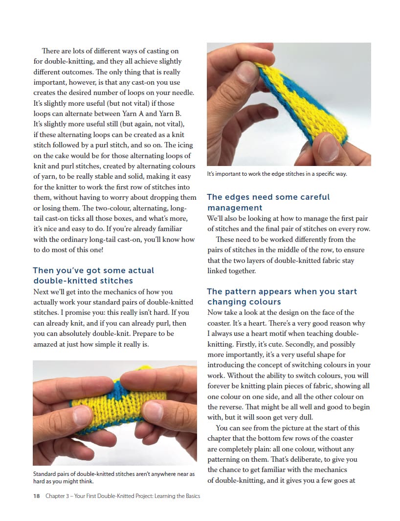 Master the art of double knitting to produce reversible, double-layered, multi-coloured knits. In its simplest form, double knitting is a form of colour work that creates a dual-layered, two-sided fabric, without there being an unattractive or float-ridden ‘wrong side’. It is therefore different to any other knitting technique and can mystify novices and experienced knitters alike. Demystifying Double Knitting takes the mystery out of the process with step-by-step explanations of the key techniques, illustrated with detailed photographs. Once the fundamentals are mastered, you can then learn to move beyond basic stocking stitch and introduce texture, shaping and even non-mirrored designs to your work. Whether you’re new to the technique or simply want to understand it better, this book offers an accessible introduction to double knitting and a celebration of the creative opportunities it offers.