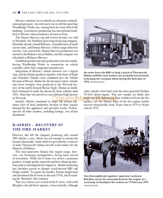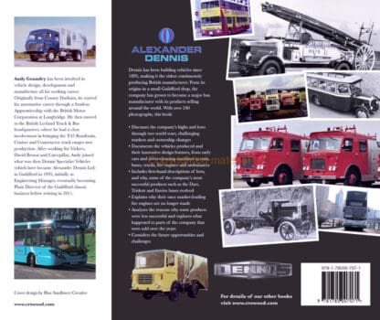 The Dennis company has been building vehicles since 1895, making it the oldest continuously producing British manufacturer. From its origins in a small Guildford shop, the company has grown to become a major bus manufacturer with its products selling around the world. This book discusses the company’s highs and lows, through two world wars, challenging markets and ownership changes. It documents the vehicles produced and their innovative design features, from early cars and street-cleaning machines to vans, buses, trucks, fire engines and ambulances. First-hand descriptions of how, and why, some of the company’s most successful products such as the Dart, Trident and Enviro buses evolved. It explains why their once market-leading fire engines are no longer made. It also analyses the reasons why some products were less successful and explores what happened to parts of the company that were sold over the years. Finally, the company’s future opportunities and challenges are considered. The author, Andy Goundry, has not only drawn on his own personal experience of almost twenty years of employment with the company but he has drawn on what is left of the company archives, private collections and first-hand accounts, to produce this book as a salutation of over 125 years of continuous manufacturing.