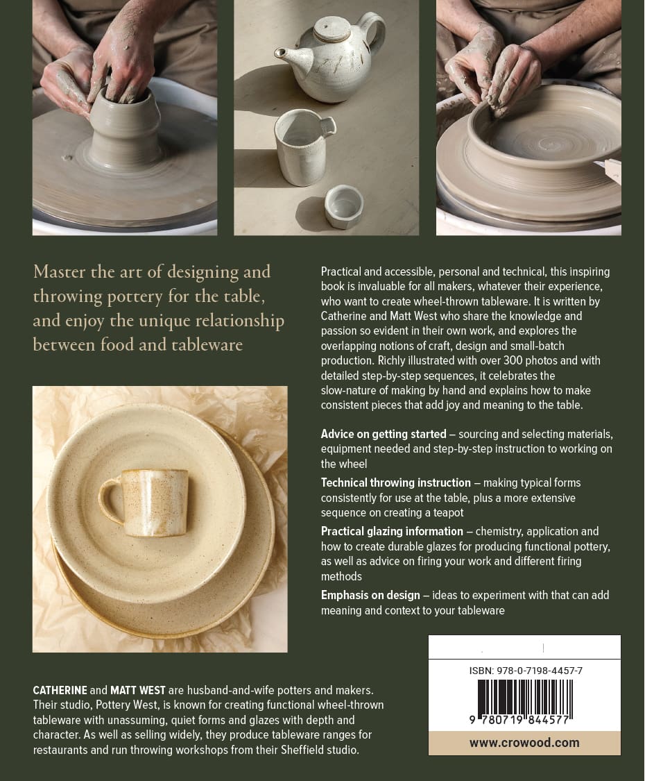Practical and accessible, personal and technical, this inspiring book is invaluable for all makers, whatever their experience, who want to create wheel-thrown tableware. It is written by Catherine and Matt West who share the knowledge and passion so evident in their own work, and explores the overlapping notions of craft, design and small-batch production. Richly illustrated with over 300 photos and with detailed step-by-step sequences, it celebrates the slow-nature of making by hand and explains how to make consistent pieces that add joy and meaning to the table.