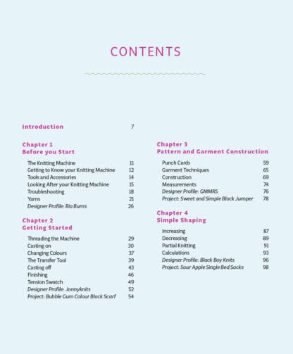 The ultimate guide to machine knitting. This book has been designed to help you demystify machine knitting. Perfect for beginners, it starts with how the machine works and how stitches are formed, all the way through to shaping garment panels to your desired size and fit. Each chapter focuses on different skills that build throughout the book, with lots of projects so you can put the skills into practice and make some knits for yourself.