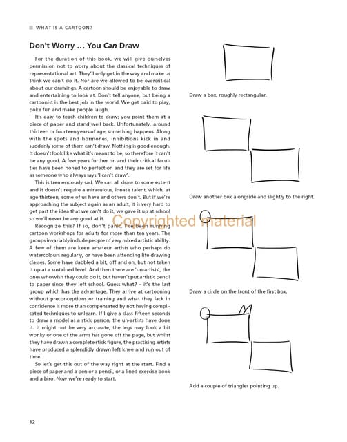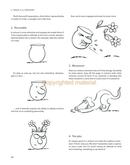 Drawing Cartoons provides invaluable support for anyone who has ever dreamed of drawing cartoons, but lacks the confidence. Taking the approach that anyone can draw, the author leads the reader through the steps of putting together cartoon figures, showing, for example, how a simple box shape can be transformed into a cartoon dog, or how a basic stick figure can convey a range of emotions. The book contains interviews with professional cartoonists who are household names, such as ‘Mac’ of The Daily Mail, ‘Matt’ of The Telegraph and Gerald Scarfe.