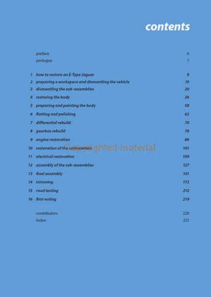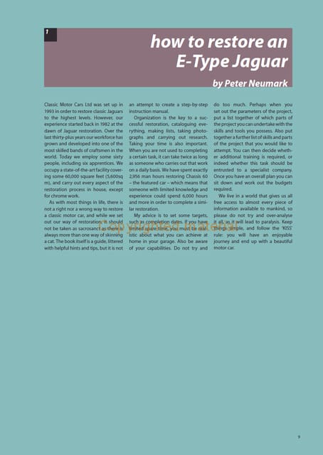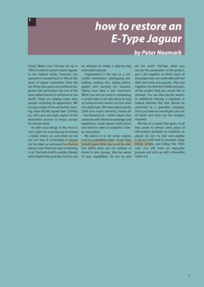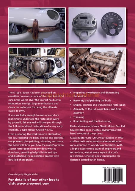The E-Type Jaguar has been described on countless occasions as one of the most beautiful cars in the world. Over the years it has built a reputation amongst Jaguar enthusiasts and classic car collectors for being the ultimate classic to own. If you are lucky enough to own one and are planning to undertake the restoration work by yourself, this manual will take you through the full nut-and-bolt restoration of a very early example, E-Type Jaguar Chassis No 60. Restoration experts from the world’s premier Jaguar restoration company, Classic Motor Cars Ltd, have written each chapter, giving you a first-hand account of the process.