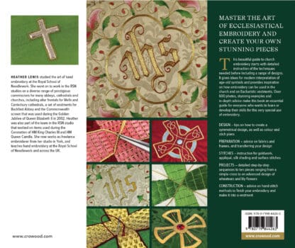 This beautiful guide to church embroidery starts with detailed instruction of the techniques needed before including a range of designs. It gives ideas for modern interpretation of age-old symbols and provides inspiration on how embroidery can be used in the church and on Eucharistic vestments. Over 600 photos, stunning examples and in-depth advice make this book an essential guide for everyone who wants to learn or develop their skills for this very special use of embroidery. Starting with a guide to the liturgical colours and Eucharistic vestments, it covers the whole process of first collecting together the materials and equipment that you’ll need, through to creating and transferring the design, and then stitching, finishing and constructing the piece. Throughout the text, Heather Lewis shares her practical tips and ideas learnt from years of embroidering at the highest level so you can achieve the best results. Beyond the practical, this book also provides inspiration and encourages you to interpret traditional themes in new ways to keep the embroidery and Christian message as relevant today as ever. Projects range from a golden cross on a stole to the flames of the Holy Spirit using applique. Step-by-step instructions, supported with clear photographs and templates, complete this impressive book.