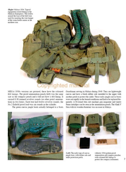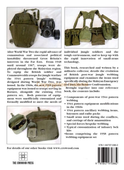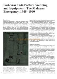 After World War Two the rapid advance of communism and associated political instability threatened Great Britain’s interest in the Far East. From 1948 until around 1967, troops were deployed throughout the Malaysian region. To equip the British soldier and Commonwealth troops or jungle warfare the 1944 pattern ‘jungle’ webbing, designed during World War Two, was issued. In the 1960s, the new 1958 pattern equipment was issued to troops serving in Borneo, alongside the existing 1944 pattern set. Both patterns of equipment were unofficially customized and formally modified to meet the needs of individual jungle soldiers and the tough environment, to keep up with the rapid innovation of small-arms technology.