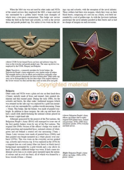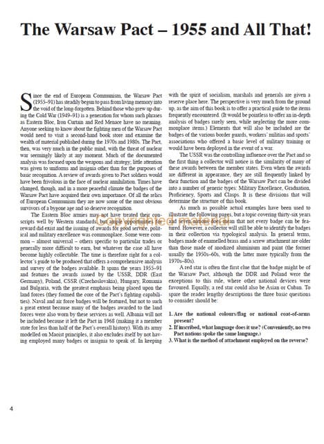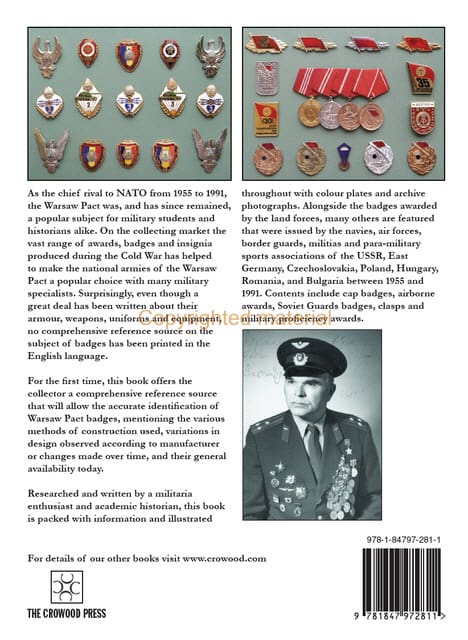 As the chief rival to NATO from 1955 – 1991, the Warsaw Pact was, and has since remained, a popular subject for military students and historians alike. On the collecting market the vast range of awards, badges and insignia produced during the Cold War has helped to make the national armies of the Warsaw Pact a popular choice with many military specialists. Surprisingly, even though a great deal has been written about the armour, weapons, uniforms and equipment, no comprehensive reference source on the subject of badges has been printed in the English language. Alongside the badges awarded by the land forces, many others are featured that were issued by the navies, air forces, border guards, militias and para-military sports associations of the USSR, East Germany, Czechoslovakia, Poland, Hungary, Romania and Bulgaria between 1955 – 1991. For the first time, this book offers the collector a comprehensive reference source that will allow the accurate identification of Warsaw Pact badges, mentioning the various methods of construction employed, variations in design observed according to manufacturer or changes employed over time, and their general availability today.