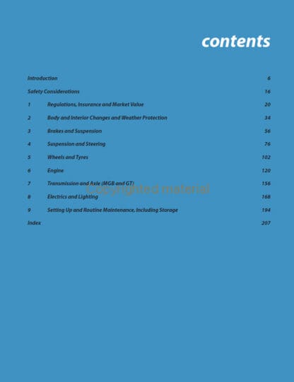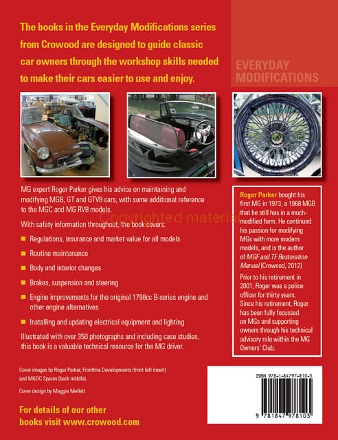 The books in the Everyday Modifications series from Crowood are designed to guide classic car owners through the workshop skills needed to make their cars easier to use and enjoy. MG expert Roger Parker gives his advice on maintaining and modifying MGB, GT and GTV8 cars, with some additional reference to the MGC and MG RV8 models. With safety information throughout, the book covers: regulations, insurance and market value for all models; routine maintenance; body and interior changes; brakes, suspension and steering; engine improvements for the original 1798cc B-series engine and other engine alternatives and finally, installing and updating electrical equipment and lighting.