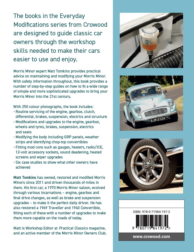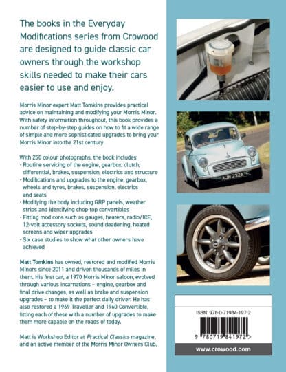 Morris Minor expert Matt Tomkins provides practical advice on maintaining and modifying your Morris Minor. With safety information throughout, this book provides a number of step-by-step guides on how to fit a wide range of simple and more sophisticated upgrades to bring your Morris Minor into the 21st century. Includes sections on Routine servicing of the engine, gearbox, clutch, differential, brakes, suspension, electrics and structure. Modifications and upgrades to the engine, gearbox, wheels and tyres, brakes, suspension, electrics and seats. Modifying the body including GRP panels, weather strips and identifying chop top convertibles. Fitting mod cons such as gauges, heaters, radio/ICE, 12 volt accessory sockets, sound deadening, heated screens, wiper upgrades. With six case studies to show what other owners have achieved
