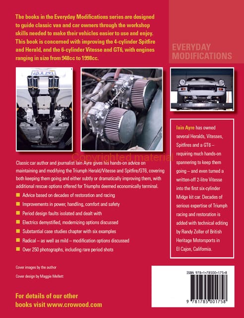 The books in the Everyday Modifications series are designed to guide classic van and car owners through the workshop skills needed to make their vehicles easier to use and enjoy. This book is concerned with improving the 4-cylinder Spitfire and Herald, and the 6-cylinder Vitesse and GT6, with engines ranging in size from 948cc to 1998cc. Classic car author and journalist Iain Ayre gives his hands-on advice on maintaining and modifying the Triumph Herald/Vitesse and Spitfire/GT6, covering both keeping them going and either subtly or dramatically improving them, with additional rescue options offered for Triumphs deemed economically terminal.
