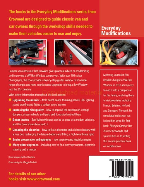 The books in the Everyday Modifications series from Crowood are designed to guide classic van and car owners through the workshop skills needed to make their vehicles easier to use and enjoy. Camper van enthusiast Rob Hawkins gives practical advice on modernizing and improving a VW Bay Window camper van. With over 700 colour photographs, the book provides step-by-step guides on how to fit a wide range of simple and more sophisicated upgrades to bring a Bay Window into the 21st century. With safety information throughout, the book covers: upgrading the interior – front bench seats, trimming panels, LED lighting, sound proofing and fitting a budget sound system; improving the ride quality – how to improve the suspension, change dampers, assess wheels and tyres and fit uprated anti-roll bars; better brakes – Bay Window brakes can be as good as a modern vehicle’s, and this book shows how to do it. Also covered is information on updating the electrics, engine preservation and upgrades including removing and rebuilding an engine.