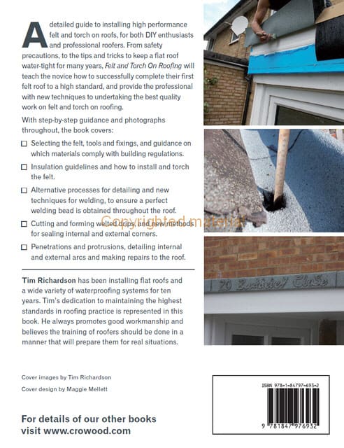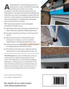 A detailed guide to installing high performance felt and torch on roofs, for both DIY enthusiasts and professional roofers. From safety precautions, to the tips and tricks to keep a flat roof water-tight for many years, Felt and Torch on Roofing will teach the novice how to successfully complete their first felt roof to a high standard, and provide the professional with new techniques to undertaking the best quality work on felt and torch on roofing.