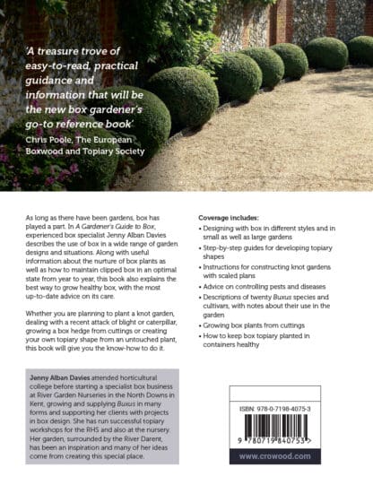 Jenny Alban Davies attended horticultural college before starting a specialist box business at River Garden Nurseries in the North Downs in Kent, growing and supplying Buxus in many forms and supporting her clients with projects in box design. She has run successful topiary workshops for the RHS and also at the nursery. Her garden, surrounded by the River Darent, has been an inspiration and many of her ideas come from creating this special place.