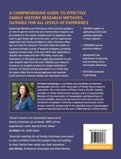 Genealogy Methods and Techniques offers practical guidance on how to get the most from your family history research and be confident in the results. Suitable both for beginners who want to get things right from the start, and for experienced researchers with thorny problems to solve, this book offers tips and tricks for everyone. This book takes the reader on a journey through a series of research strategies, providing guidance at every step of the way. With clear explanations, real-life case studies and over 100 tables, charts and illustrations, it will equip you to apply best practices to your own research right from the start. Whether your research focuses on an in-depth analysis of a single individual or location, or tracing multiple generations of a family tree, this guide offers the structured approach and essential tools required to achieve reliable and meaningful results.