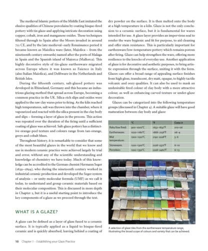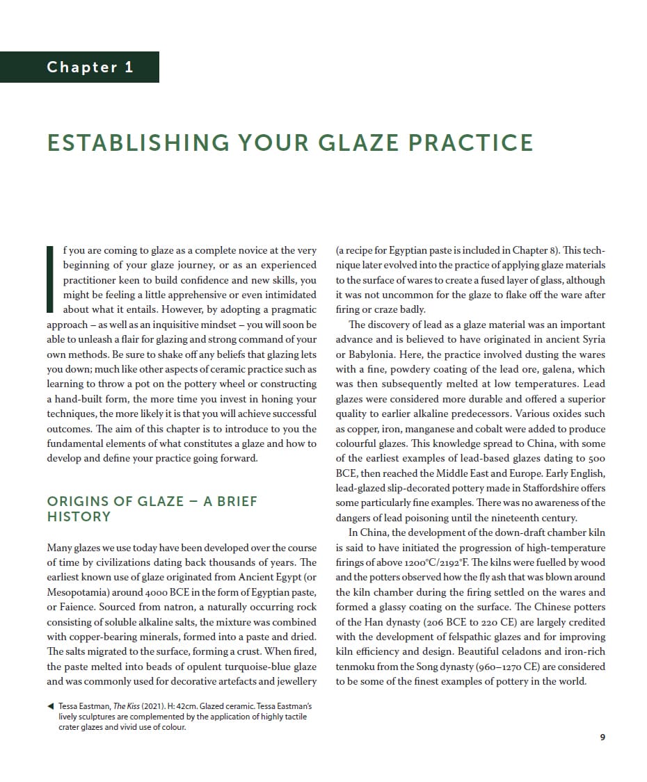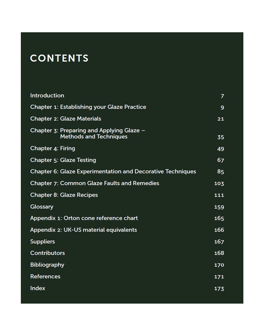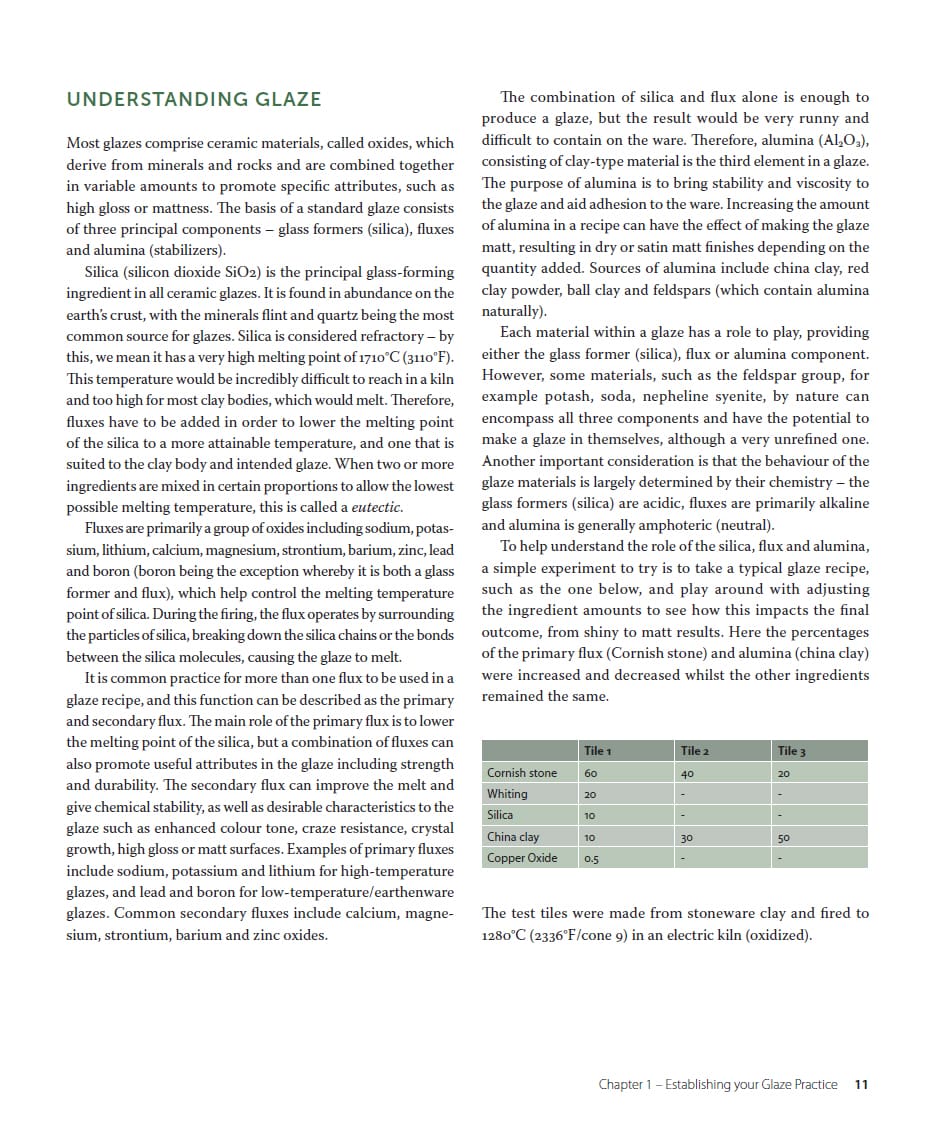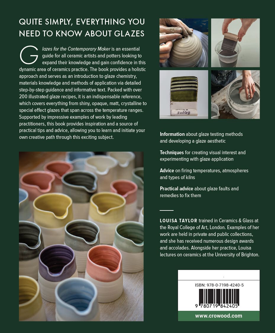 Quite simply, everything you need to know about glazes. Glazes for the Contemporary Maker is an essential guide for all ceramic artists and potters looking to expand their knowledge and gain confidence in this dynamic area of ceramics practice. The book provides a holistic approach and serves as an introduction to glaze chemistry, materials knowledge and methods of application via detailed step-by-step guidance and informative text. Packed with over 200 illustrated glaze recipes, it is an indispensable reference, which covers everything from shiny, opaque, matt, crystalline to special effect glazes that span across the temperature ranges. Supported by impressive examples of work by leading practitioners, this book provides inspiration and a source of practical tips and advice, allowing you to learn and initiate your own creative path through this exciting subject.