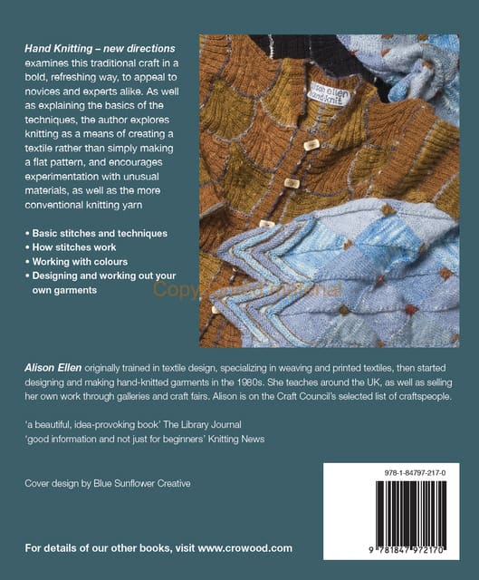 Hand Knitting – new directions examines this traditional craft in a bold, refreshing way, to appeal to novices and experts alike. As well as explaining the basics of the techniques, the author explores knitting as a means of creating a textile rather than simply making a flat pattern, and encourages experimentation with unusual materials, as well as the more conventional knitting yarn.