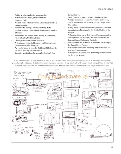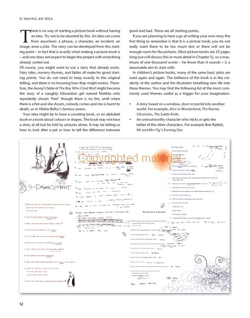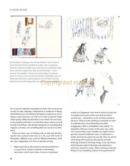 This beautiful book answers all these questions and more. With practical tips and ideas throughout, it explains and follows the journey from first idea to final completed book. It is filled with illustrations that show how these images are made, and offers a rare chance to see the roughs, visuals and idesa sheets from a variety of children’s illustrators. exercises support the ideas discussed and suggest ways to develop them.