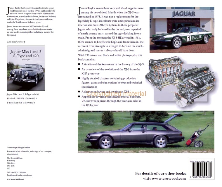 James Taylor remembers very well the disappointment among his petrol-head friends when the XJ-S was announced in 1975. It was not a replacement for the legendary E-type; its colours were uninspired; and its interior was drab. All credit, then, to those people at Jaguar who truly believed in the car and, over a period of nearly 20 years, turned the ugly duckling into a swan. From the moment the XJ-S HE arrived in 1981, there seemed to be renewed hope, and from then on, the car went from strength to strength to become the much-admired grand tourer it always should have been. The book contains a timeline of the key events in the history of the XJ-S and an overview of the evolution of the XJ-S from the XJ27 prototype. There are Appendices covering identification/serial numbers, UK showroom prices through the years and sales in the US by year.