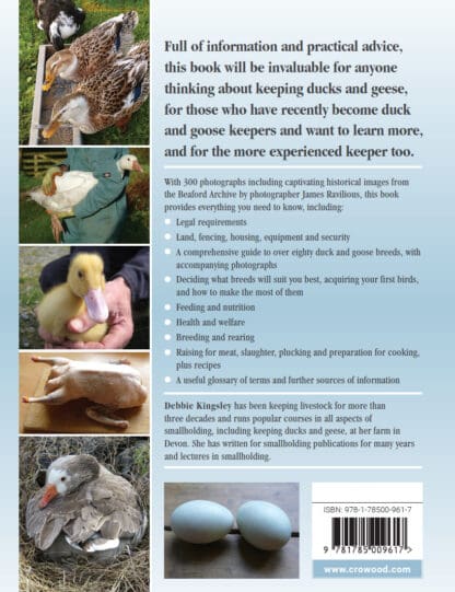 Debbie Kingsley has been keeping livestock for more than three decades and runs popular courses at her farm in Devon in all aspects of smallholding, including keeping ducks and geese. She has written for smallholding publications for many years and lectures in smallholding.