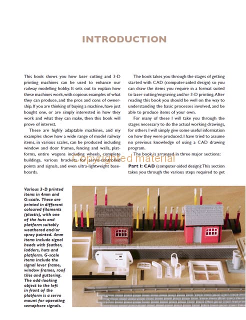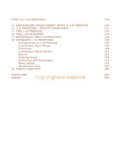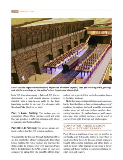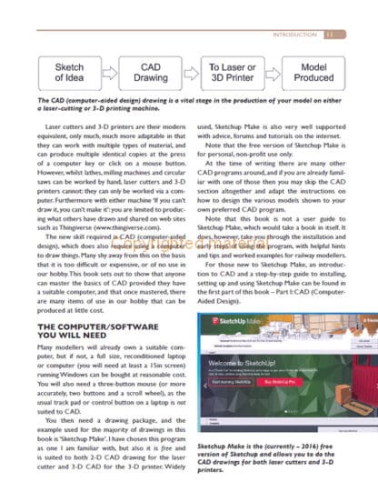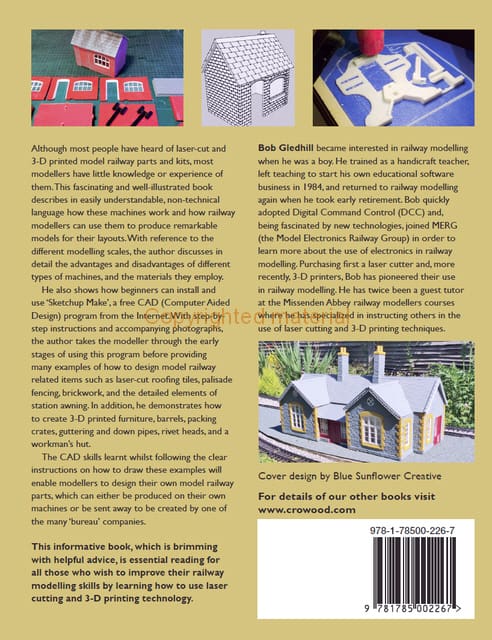 Although most people have heard of laser-cut and 3-D printed model railway parts and kits, most modellers have little knowledge or experience of them. This fascinating and well-illustrated book describes in non-technical language how these machines work and how railway modellers can use them to produce remarkable models for their layouts. With reference to the different modelling scales, the author discusses in detail the advantages and disadvantages of different types of machines, and the materials they employ. He also shows how beginners can install and use ‘Sketchup Make’, a free CAD (Computer Aided Design) program from the Internet. With step-by-step instructions and accompanying photographs, the author takes the modeller through the early stages of using this program before providing many examples of how to design model railway related items such as laser-cut roofing tiles, palisade fencing, brickwork, and the detailed elements of station awning. In addition, he demonstrates how to create 3-D printed furniture, barrels, packing crates, guttering and down pipes, rivet heads, and a workman’s hut. The CAD skills learnt whilst following the clear instructions on how to draw these examples will enable modellers to design their own model railway parts, which can either be produced on their own machines or be sent away to be created by one of the many ‘bureau’ companies.