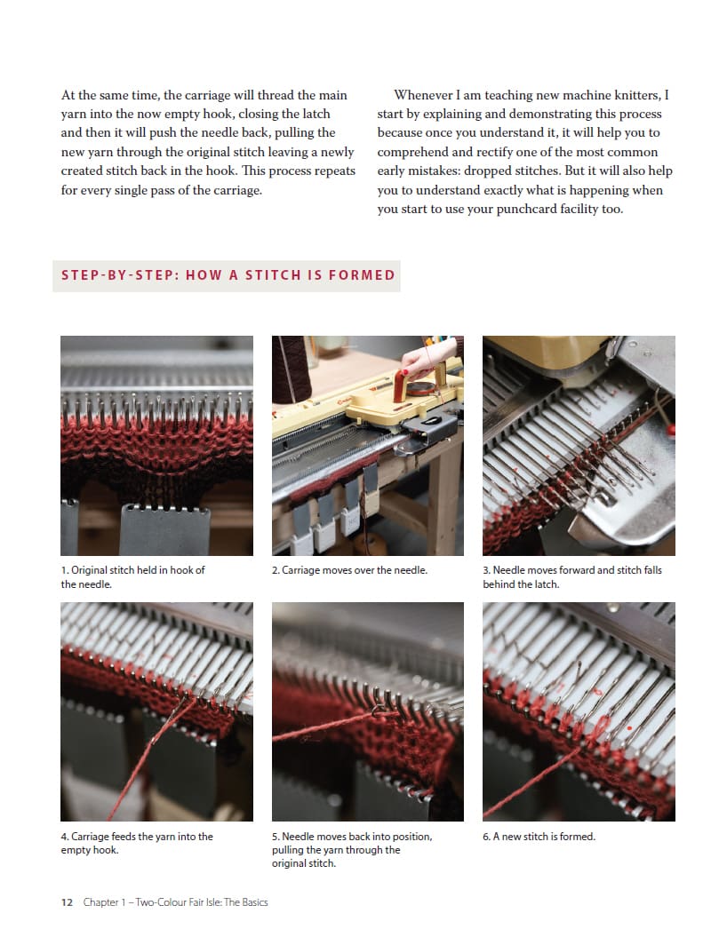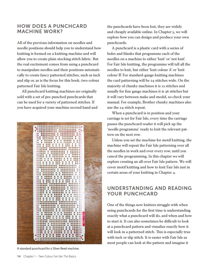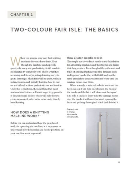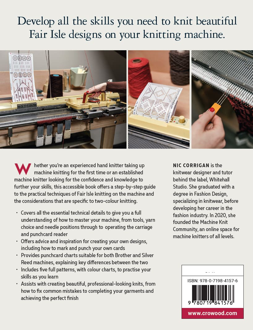 Whether you’re an experienced hand knitter taking up machine knitting for the first time or an established machine knitter looking for the confidence and knowledge to further your skills, this accessible book offers a step-by-step guide to the practical techniques of Fair Isle knitting on the machine and the considerations that are specific to two-colour knitting. Includes 5 full patterns with colour charts.