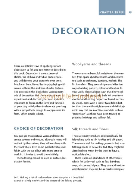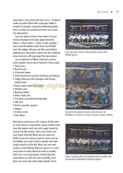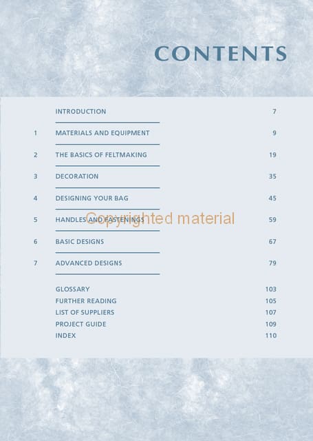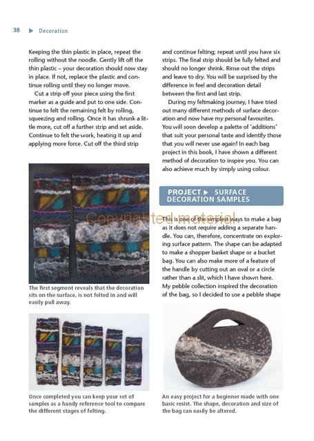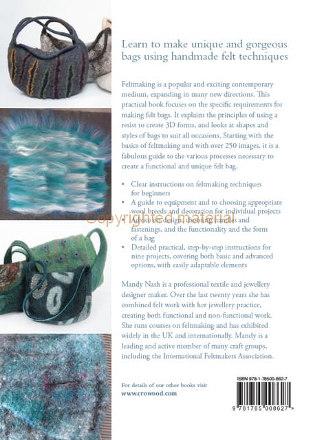 Feltmaking is a popular and exciting contemporary medium, expanding in many new directions. This practical book focuses on the specific requirements for making felt bags. It explains the principles of using a resist to create 3D forms, and looks at shapes and styles of bags to suit all occasions. Clear instructions on feltmaking techniques for beginners are given. A guide to equipment and to choosing appropriate wool breeds and decoration for individual projects are given too. There is advice on design, choosing handles and fastenings, and the functionality and the form of a bag. There are detailed practical, step-by-step instructions for nine projects, covering both basic and advanced options, with easily adaptable elements. It is a fabulous guide to the various processes necessary to create a functional and unique felt bag.