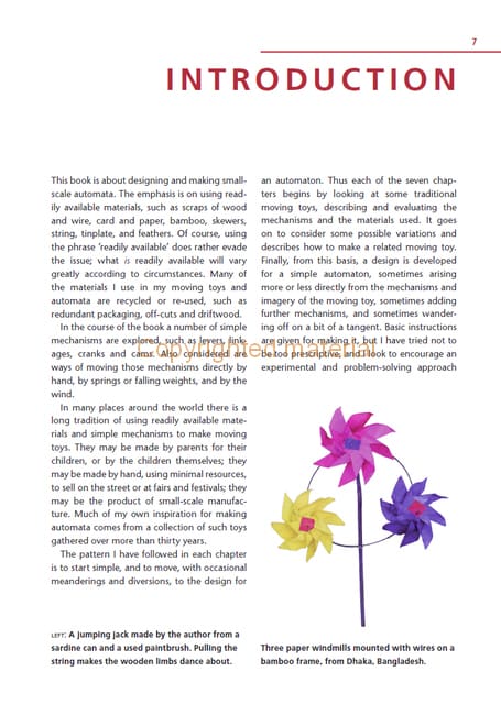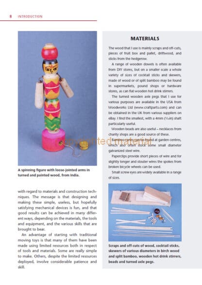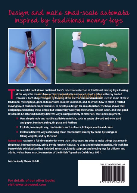 This beautiful book draws on Robert Race’s extensive collection of traditional moving toys, looking at the ways the makers have achieved remarkable and varied results, often with very limited resources. Each chapter begins by looking at the mechanisms and materials used in some of these traditional moving toys, goes on to consider possible variations, and describes how to make a related moving toy. It continues, from this basis, to develop a design for an automaton. The book shows that designing and making these simple but wonderfully satisfying mechanical devices is fun, and that good results can be achieved in many different ways, using a variety of materials, tools and equipment such as wood and wire, card and paper, bamboo, string, tin plate and feathers.
