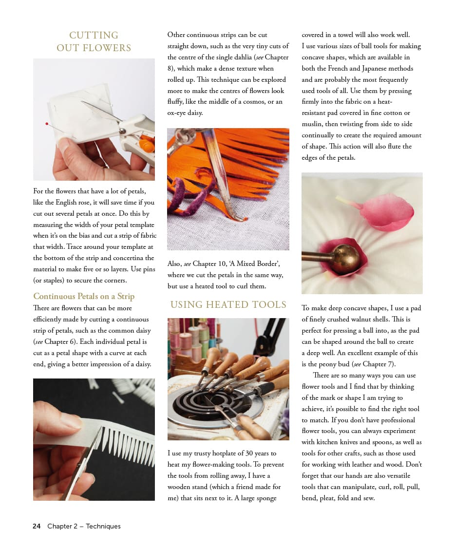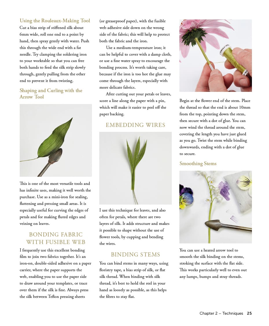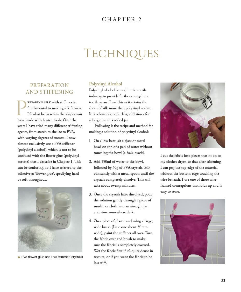 Gives instructions on techniques, including how to paint with dyes and mix colours, stiffen silk, and shape petals and leaves