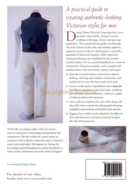 During Queen Victoria’s long reign there were constant, often subtle, changes to men’s clothing in the large, diverse and growing population. This practical book guides you through the male fashions of the time and includes eighteen garments typical of the era. Each project is carefully grounded in historical research, while traditional tailoring techniques are simplified for the modern costume maker. It is an essential handbook that describes fabrics and tools for pattern drafting, tailoring and costume construction, and explains how to get the best results from each. It covers a wide variety of gentleman’s attire adaptable for different occupations and social status, including assorted shirts, trousers, breeches, a tailcoat, a jacket, a frockcoat and several waistcoats. There is a full set of patterns for each outfit, along with clear, full colour construction photographs and finally, the author suggests how outfits can be adapted to fit different sizes and characters, and gives practical insights into the making process.