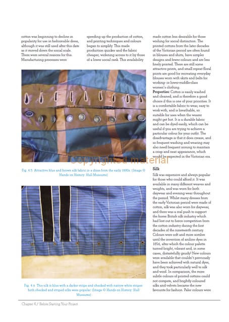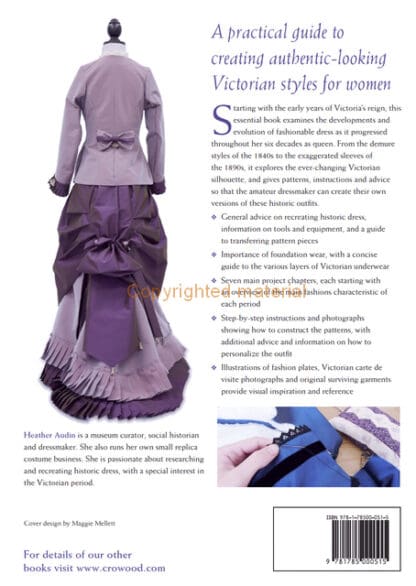 Starting with the early years of Victoria’s reign, this essential book examines the developments and evolution of fashionable dress as it progressed throughout her six decades as queen. From the demure styles of the 1840s to the exaggerated sleeves of the 1890s, it explores the ever-changing Victorian silhouette, and gives patterns, instructions and advice so that the amateur dressmaker can create their own versions of these historic outfits. Other topics covered include: information on tools and equipment; a guide to transferring pattern pieces; a concise guide to the various layers of Victorian underwear; step-by-step instructions with colour photographs to help construct the patterns and advice on how to personalize the outfit. Illustrations of fashion plates, Victorian carte de visite photographs and original surviving garments provide visual inspiration and reference.